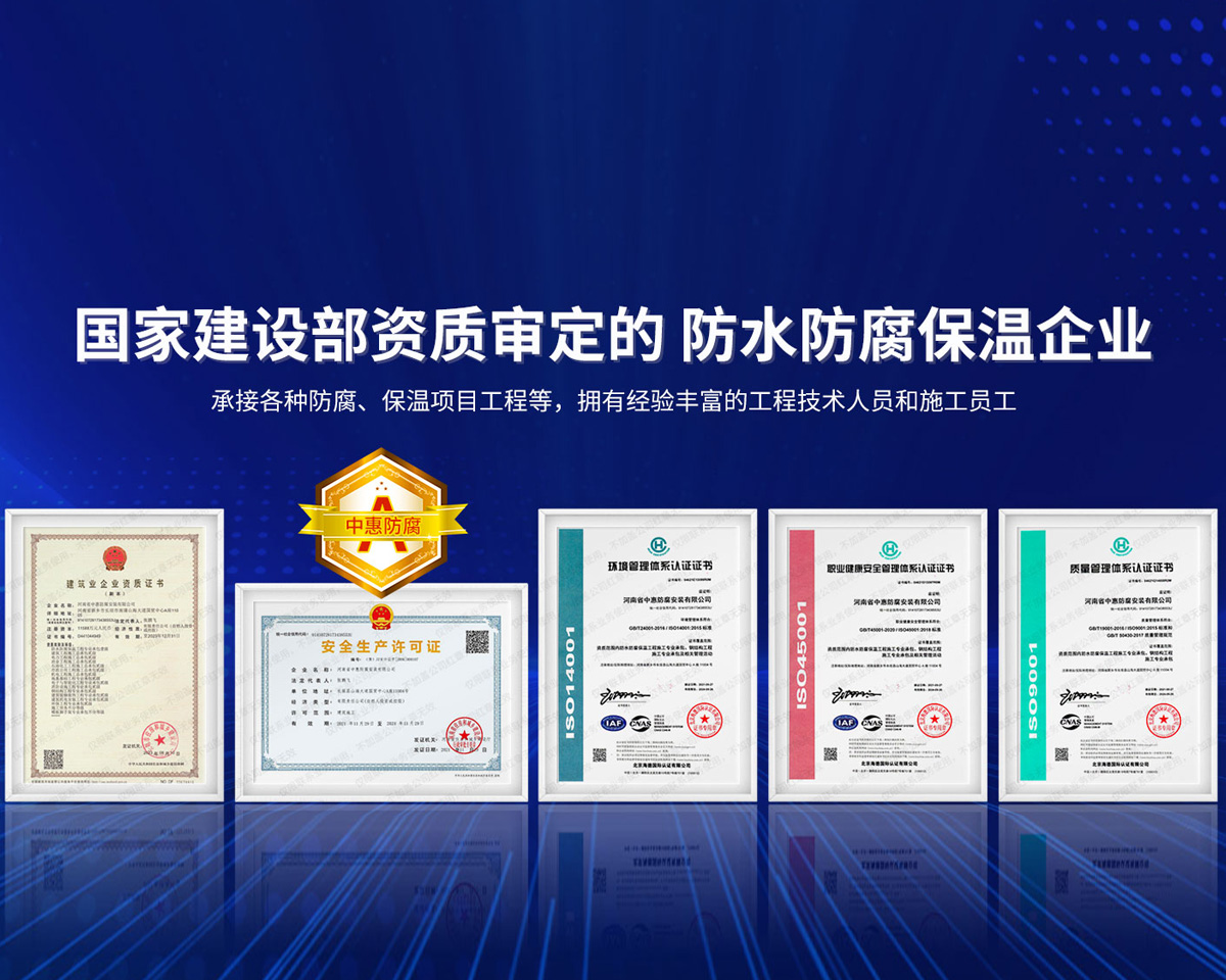 公司經營范圍:防水防腐保溫工程;消防設施工程;建筑裝修裝飾工程;建筑機電安裝工程;電力工程;建筑工程;石油化工工程;工業清洗工程;油罐清洗工程;鋼結構工程;環保工程;模板腳手架工程;電纜防火封堵、防污閃噴涂、外墻外保溫工程;各類施工勞務作業;設備維修、船舶鉚焊、涂裝;電力工程材料、建材、防水材料、防火材料、防腐保溫材料銷售,并相繼通過了GB/T19001-2008idtISO9001:2008GB/T50430-2007質量管理體系認證證書。GB/T24001-2004idtISO14001:2004環境管理體系認證證書。GB/T28001-2011idtOHSAS18001:2007職業健康安全管理體系認證證書。公司是中國防腐蝕于防護協會、中國施工企業管理協會、電力協會和中國鋼結構防水協會會員單位。 公司的經營業務涵蓋了石油、化工、電力、冶金、煤炭、船舶、國防、燃氣、水利、環保、交通運輸、航空及國防軍工和輕紡市政等行業的防腐保溫絕熱設備。鋼結構安裝、防火、防水、金屬噴鍍、聚脲噴繪、陰極保護、防滲透堵漏、玻璃鋼及各種磚版材料襯里、橡膠襯里、煙氣硫和耐酸溶劑腐蝕等工程施工。公司連續十年榮獲“省市先進施工企業”“安全生產先進單位”“重合同,守信用企業”和“AA***資質企業”的稱號。2000年被命名為市級文明單位,2002年被國家工商行政管理局命名為“重合同,守信用的企業”、被中國工業防腐蝕技術協會命名為“防腐蝕企業,能源節約及環境保護領域有豐富的經驗和***的業績。工程一次交驗合格率100%。其中攀枝花鋼鐵公司煉鐵廠四號高爐及熱風爐防腐工程、上海寶鋼公司煤氣柜防腐工程、撫順石油一廠裝置防腐項目、齊魯石化公司稀烴廠高塔防腐工程、吉林化學工業公司煉油廠油罐防腐工程、天津石化熱電廠六號爐頂棚聯絡管保溫工程、大慶油田(太倉)力神泵業工程、中國化學工程第十一建設工程、中原油田勘探局工程、中國石化銷售有限公司華北分部、魯皖輸油管道工程、貴州開磷息烽合成氨工程、陜西黃陵煤化工程、中國石油天然氣西部管道塔里木輸油工程、邯鋼集團邯寶鋼鐵公司煉鐵工程、德州供電工程、吉寶(南通)船廠工程,偃師華潤熱力工程、鄭州熱力總公司。 河南省中惠防腐安裝有限公司愿以豐富的施工經驗,***的技術,***的設備,***的管理,***的服務,竭誠為國內外廣大的用戶提供***滿意、******的工程作品。 我公司愿與國內外同仁一道,團結協作,共同推進防腐蝕行業發展! 公司地址:河南省長垣縣建設路北段360號 固定電話:0373-8866488 郵編:453400 網址:http://www_zhff_com_cn.fuanmz.com